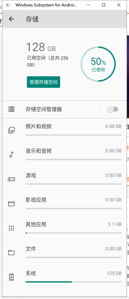 WSA提供256GB的虚拟存储空间(未实际占用),