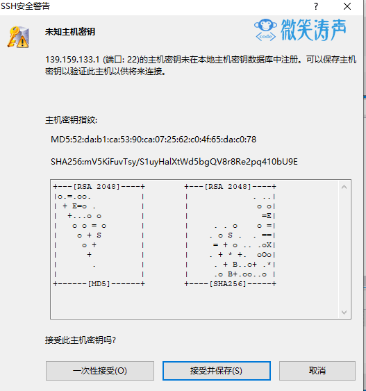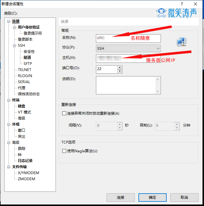 2. 名称是任意的,主机填写了自己的云服务器的互联网IP地址。单击连接。