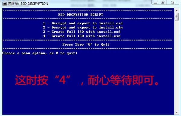 3 (建议关闭毒药程序) 作为管理员运行 Decrypt.com.cmd, 在弹出对话框中键入“ 4”, 等待 ESD 图像转换为 ISO 图像, 并在解密时访问 。 (cmd) ISO 图像 。