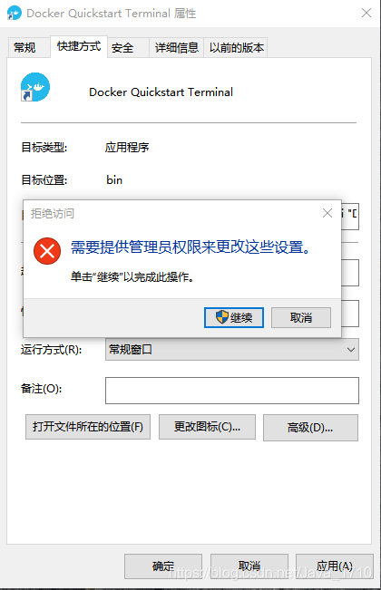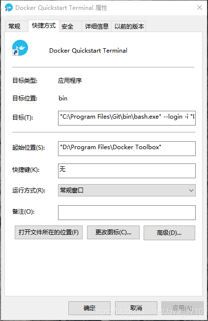 鼠标右键点击 Docker QuickStart 图标 > 点击属性 > 更改目标路径