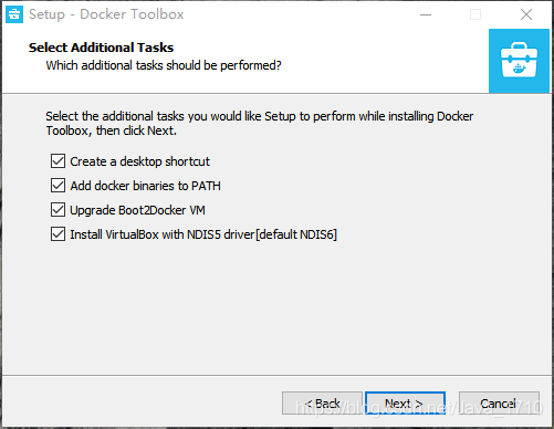 Install VirtualBox 是默认不选择,如果没有安装 VirtualBox 选择) > (Next >)