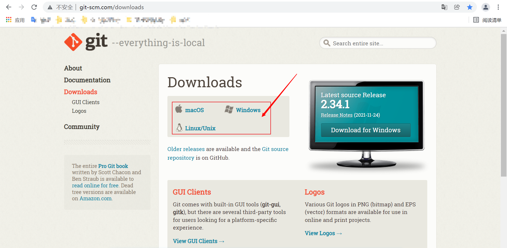 Git 管理工程版本必须安装在计算机上,才能使用。 以下网站可通过浏览器访问,用户可根据自己的操作系统选择正确的 Git 软件包: