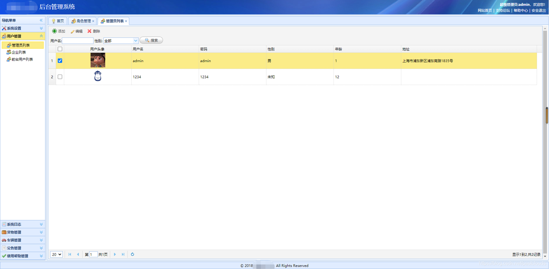 超级管理人员:系统管理、用户管理、企业用户管理、一般用户管理、货物类型管理、车辆管理、公告管理、用户帮助等等。