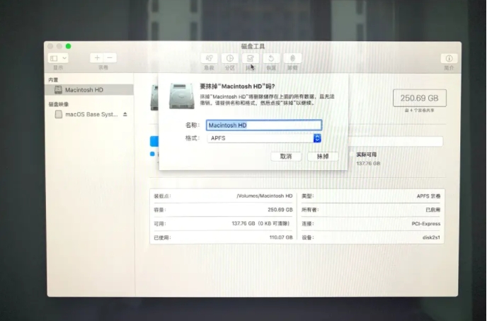 4. 您是否在此点弹出一个要擦掉“mac os o” 的提示? 重要的是要注意, 在此情况下, 磁盘格式必须是 APFS ; 否则, 其它磁盘格式将与 Adobe pkg 格式等一些应用程序的安装库不兼容 。