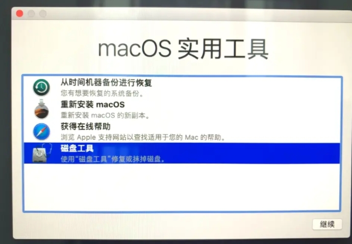 选择 " 磁盘工具 " 和 " 继续 " 。