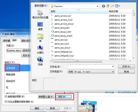 3、在鼠标属性的自定义中,选中“正常选择”,然后点击“浏览”,选择对应图标,依次类推双击“帮助选择”选择对应图标,不想修改的图标可以不选择。