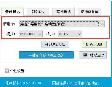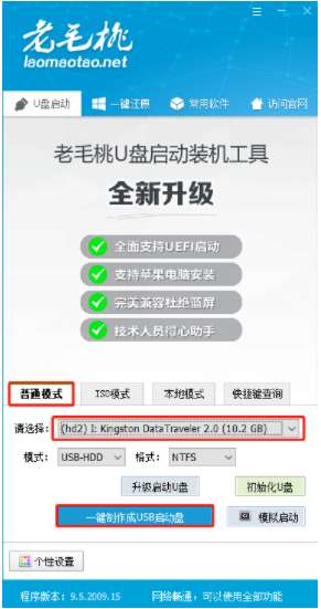 2、在软件主界面选择插入的u盘选项,模式就按照默认的usb-hdd和ntfs格式。接着点击“一键制作成USB启动盘”。
