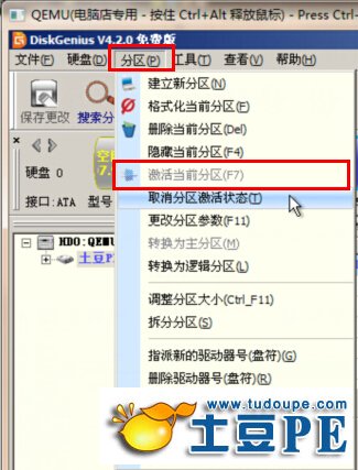(2)鼠标单击一下C盘,然后在菜单栏找到“分区”,下拉找到“激活当前分区”选项,确认后,C盘激活成功。