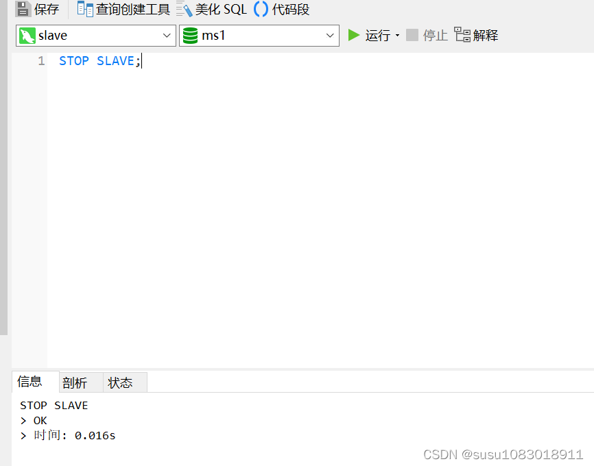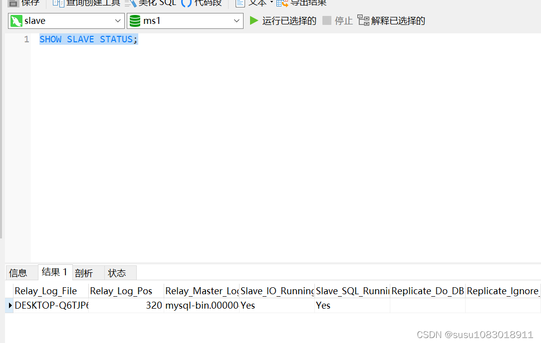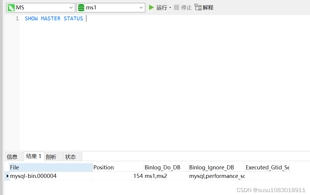 本人使用navicat连接主从数据库,选择主库:SHOW MASTER STATUS查询主库的binlog文件名以及起始点position