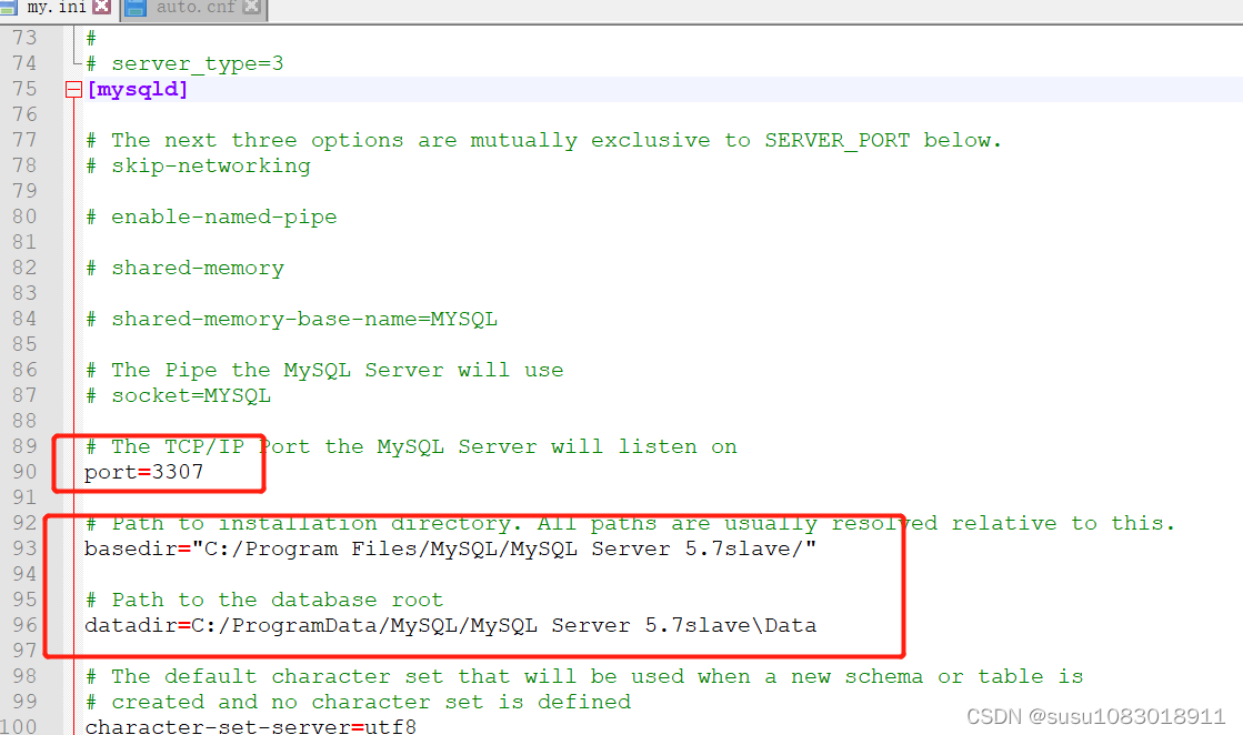 4.修改从数据库的配置文件my.ini 的服务端口以及文件夹路径和数据存储路径