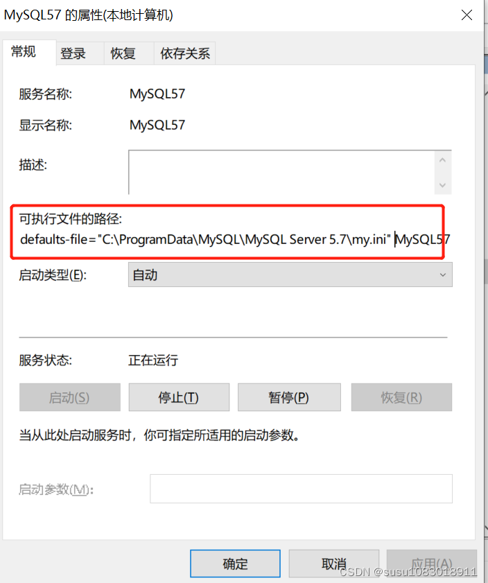 1.开始---->运行---->services.msc,或者按住windows按键+R 打开cmd,输入services.msc,打开服务列表,找到服务MYSQL57 ,查看该服务的配置文件所在路径,以及Mysql的安装路径。