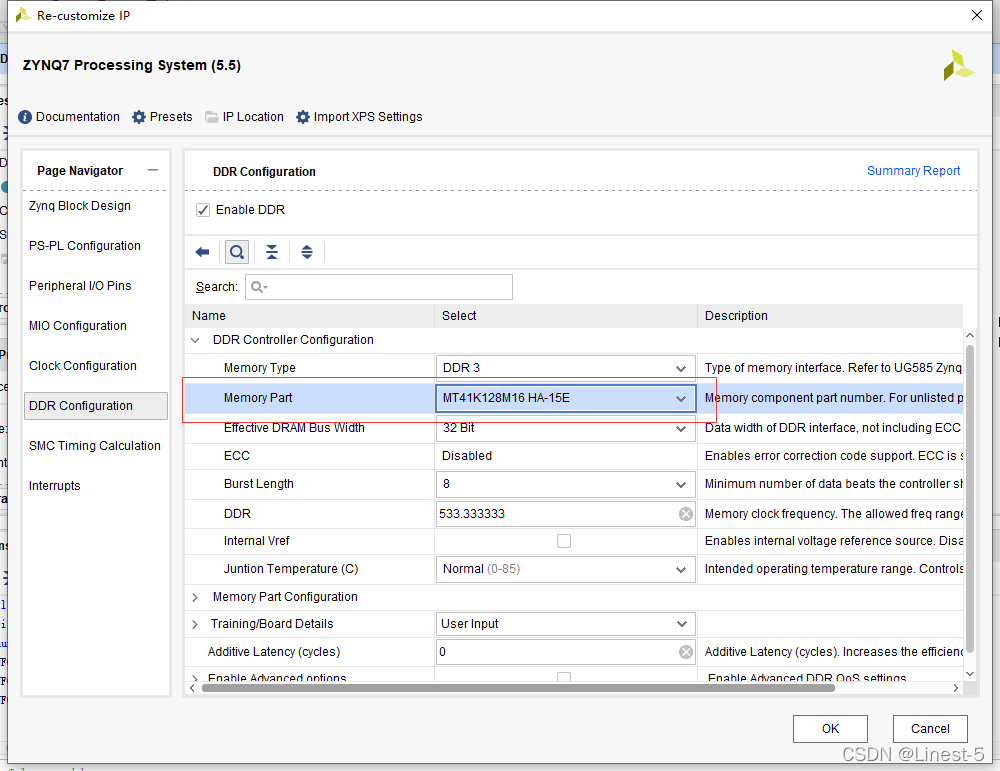 DDR的型号配置错误。间接会导致的结果是,在调试debug时,会发现cpu一直处于running的状态,但是在控制台并不能看到打印的信息,并且不管是只用了PS端或者是PS、PL端都用了,都不能在控制台上出现打印信息,但是程序可以烧录到板子上(program FPGA时发现板子上的蓝灯会亮),这说明板子本身是没问题的,排除了接线的问题,最终发现是在配置block design的DDR的信息时,DDR的型号选择错误的原因,型号选择错误会导致,程序烧录进板子后,但是由于没有配置对内存,因此程序无法存入,因此也就无法通过串口输出信息,cpu就会处于一直running的状态。DDR的相关配置信息可以在zedboard的user guide(ug)上查到。