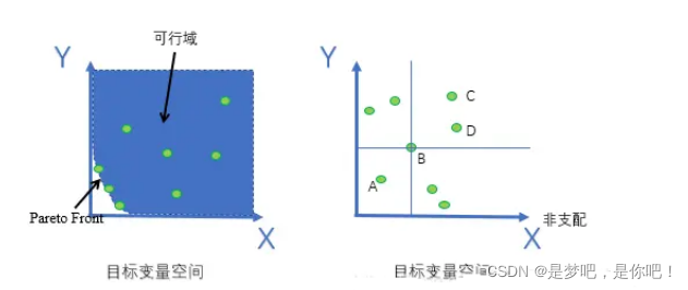 在右图中,可以看出,B支配C,D两点,在A点,B是被支配的,其余空间则是非支配