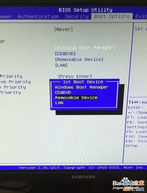 3. 将鼠标指针移动到初始启动设备选项,然后按 Enter 键。在对话框中,将鼠标指针拖到“可移动设备”,然后按 Enter 键。