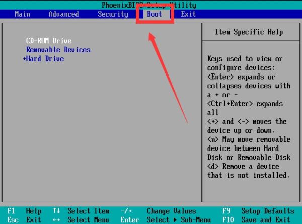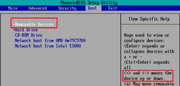 3. 为启动驱动器,按 " + " 键将选择向上移动,将可移动设备向上移动。