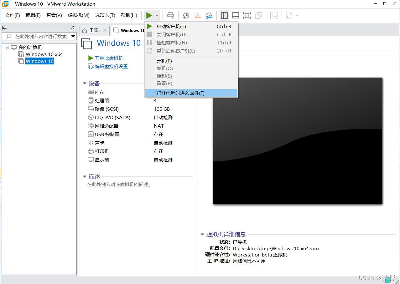 您可以在 vm 程序中选择“ 启用电源”, 输入虚拟 BIOS, 或者您可以启动虚拟计算机, 并立即击中 F2 。