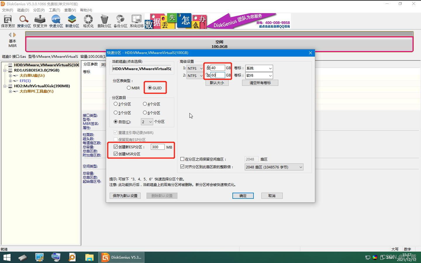 虚拟硬盘驱动分区( 分区表格类型) 是 GUID, 并特别注意检查“ 新建新的 ESP 分区” 和“ 创建 MSR 分区”, 这与安装 Win7 略有不同, Win7 通常是 MBR 分区表 :