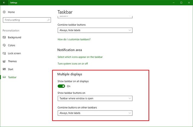 如果你有一个多监测器配置,您可以选择将义务栏扩展至所有显示。以获得更多的空间。要让义务栏在所有显示器上可见,请右键单击义务栏,选择义务栏设置,然后,在多个显示显示下,选择在所有显示开关上,此命令显示显示任务栏。