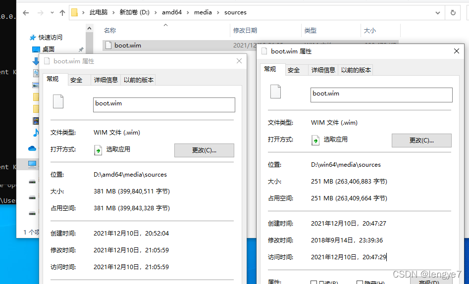执行完了之后会在D盘生成一个boot.wim。下面可以对比新旧两个boot.wim,新的明显大了不少。