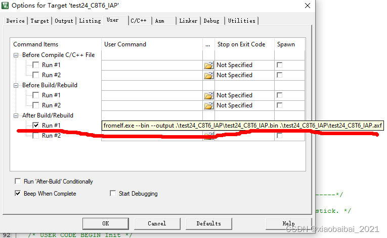 因为我们通过串口传输给boot程序写入到flash中的文件必须是bin文件格式,所以要在keil中设置编译后自动生成bin文件。这样,之后编译完成,会自动将axf文件转换为bin文件,可以在工程目录下找到生成的bin文件。