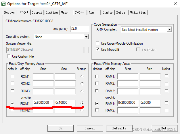 把程序存储区的起始地址,修改为我们划分好的app程序起始地址0x08003000(严格来讲,后面的大小0x10000也需要修改,但是如果我们的app程序不大,不会超过flash的最大地址,不修改也无妨)。