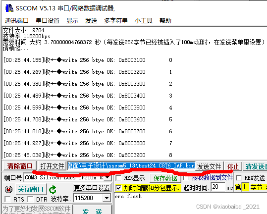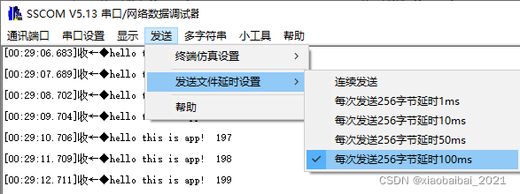 设置一下发送延时,因为flash的写入比较耗费时间,所以,我们使用sscom的发送文件延时功能,每发送256字节,延时100ms,以便MCU有足够的时间把这256字节数据写入flash: