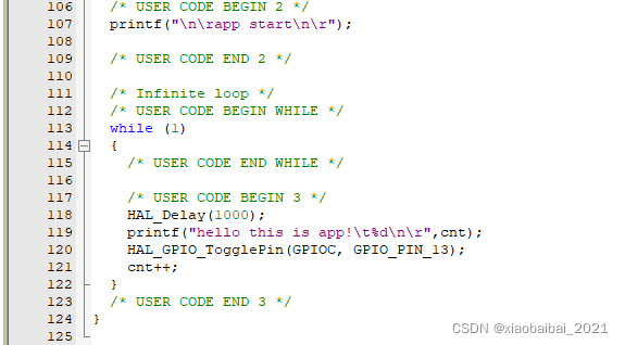 至于app函数的主体部分,就随意了,实现任何你想要的功能都可以。本文例子中,实现的是每秒打印一行信息,并闪一下LED: