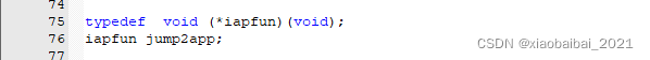 一是jump2app的赋值和调用,例子中先定义了一个函数指针jump2app,然后把app程序的入口地址赋值给它,最后直接调用jump2app()函数就可以跳转到app程序执行了;这里涉及到C语言的函数指针相关的内容;