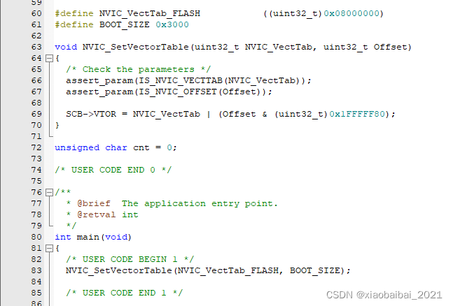 核心部分就是在main函数的起始,调用NVIC_SetVectorTable这个函数,来设置中断向量表的偏移量。