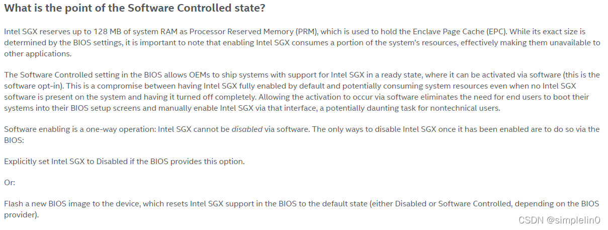 根据INTEl的官方建议, 目前的电脑主板在BIOS设置上只保留了Disabled和Software Controlled来开启和关闭SGX扩展