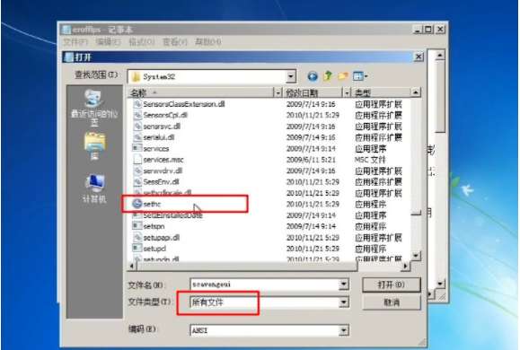 点击“文件-打开”,依次点击打开“C盘-Windows-system32”进入,将文件类型设置为“所有文件”,确保可以查看所有文件,找到“sethc”文件,并重命名为“sethc-123”;