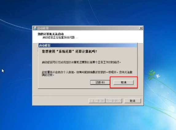2、等待windows加载文件,出现“系统还原”时,点击取消,不要还原。