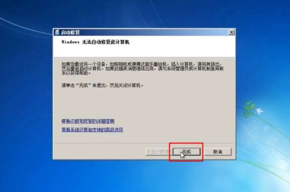 关闭所有窗口,回到自动修复界面,点击“完成”,等待电脑重启;