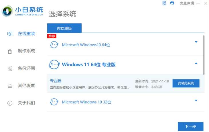 2、选择微软原版系统中的‘windows11 64位 专业版’后,点击‘安装此系统’。