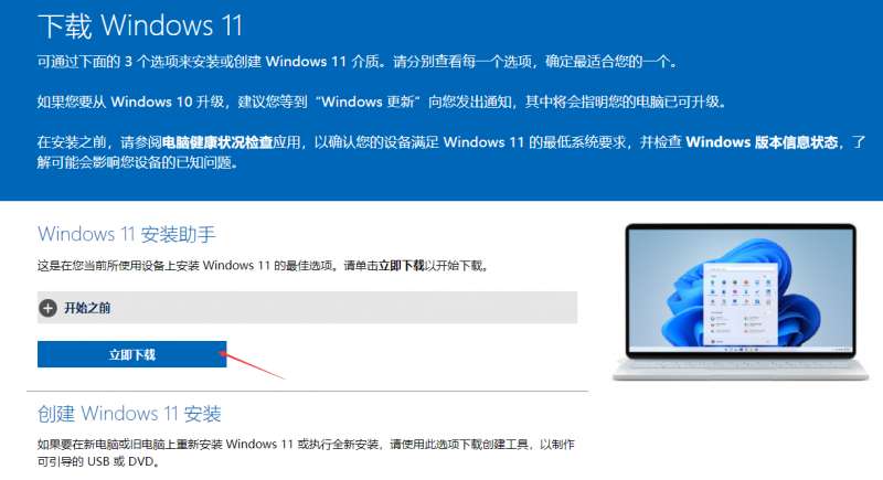 1、首先依然是打开 Windwos 11 升级官网主页,然后点击下载这一媒体创建工具。