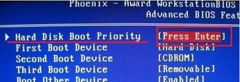 2、在Advanced BIOS Features选项中找到First Boot Device(第一启动项)并将其设置为Hard Disk(硬盘),在Hard Disk Boot Priority中选择当前所使用的硬盘;