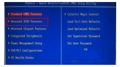 第二步、使用上下左右四个光标键,调整光标到“Advanced BIOS Features”处,然后按回车键: