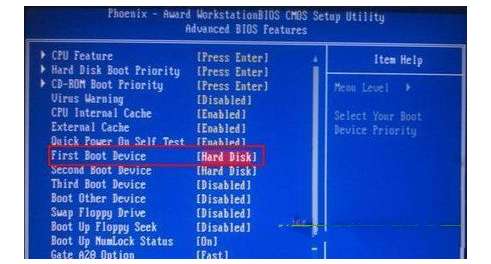 第三步、光标定位到在“First Boot Device”处,然后按回车键: