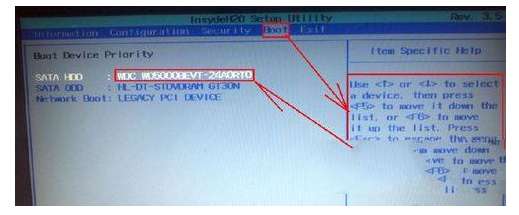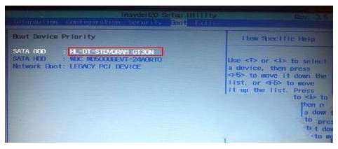 本文中的笔记本,设置方法是使用光标键定位,然后按F5键将选中项目向下移动,F6键将选中项目向上移动。因此,本文的设置方法为光标定位到第一个项目,即硬盘处,然后按F5键:
