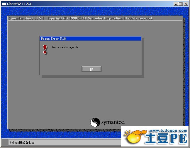 有些用户在使用U盘装系统时,打开土豆一键重装系统工具,安装WIN7系统弹出not a valid image file错误(如下图),导致系统安装失败,通过翻译错误提示not a valid image file的英文意思:不是有效的图像文件。通过字面意思我们可以理解为GHOST找不到镜像文件,导致GHOST软件找不到我们下载好的WIN7系统文件的原因有哪些?