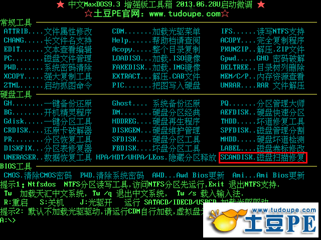1、电脑硬盘可能存在坏道,导致安装时过不去,此时,我们可以通过U盘装系统盘的maxdos9.3工具箱中的scandisk 磁盘扫描修复工具,进行硬盘修复,如下图所示:
