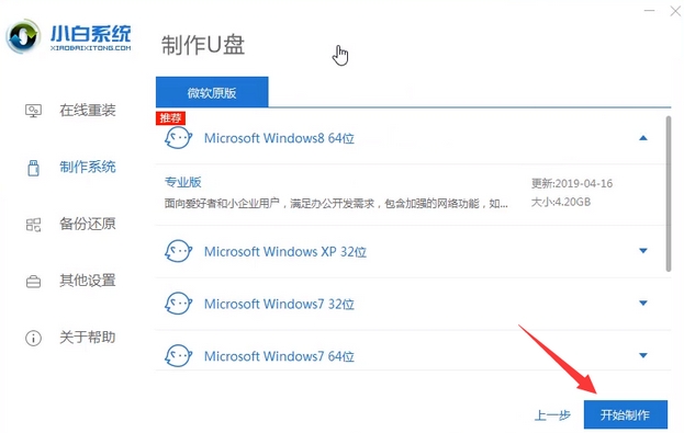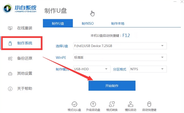 一. 打开下载的小白键以重新装入系统软件,在测试软件后进入主界面,选择左菜单生产系统,并单击开始生产。