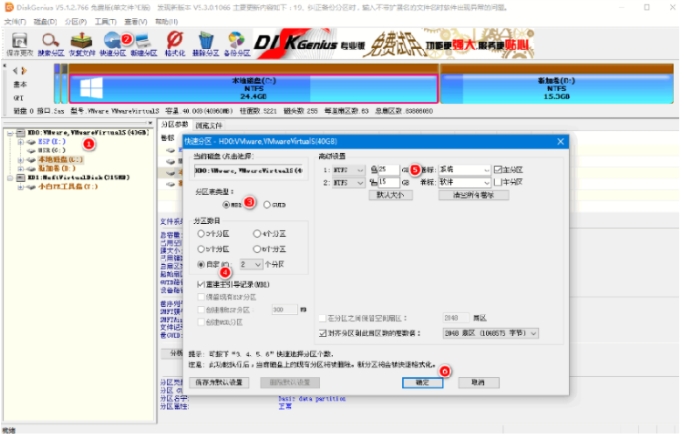 四. 没有必要在加入 PE 系统后完全再分配接下来的步骤。 如果您想要创建分区, 请启动 [DG 分区工具], 选择快速分区, 配置分区的数量和大小, 安装系统的主分区设置在 50 G 以上, 并选择执行分区 。