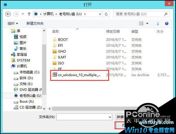 3. 此时将弹出一个搜索限制窗口。只要打开闪存驱动器, 浏览到 Win10 ISO 系统镜像文件, 并按下 Open 按钮, 如下图所示 :