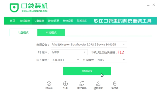 2. 关闭毒杀程序,将口袋PE发射到主界面,然后选择“u-disk模式”作为下一步。