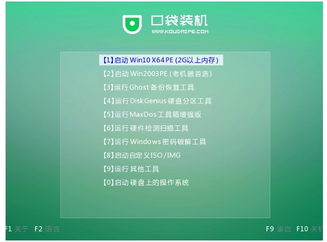 7. 输入 PE 接口并按“ win10x64PE(2 G+ RAM) ” 返回要继续的密钥。