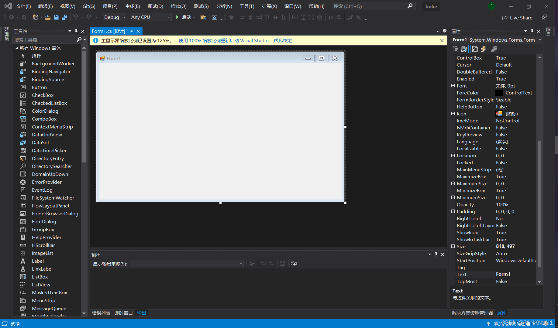 左手工具箱提供内置的 VS 控制,可用于构建窗体。