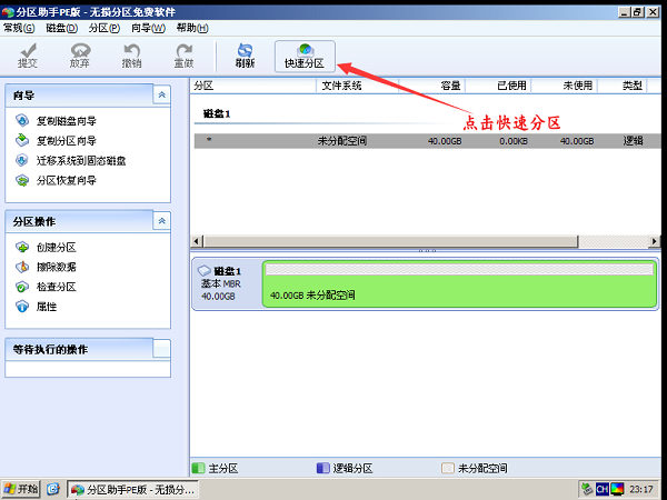 1. 打开Plum Division的 PE 桌面肋骨,选择您想要的分区的磁盘,并点击上面的快速分区按钮。