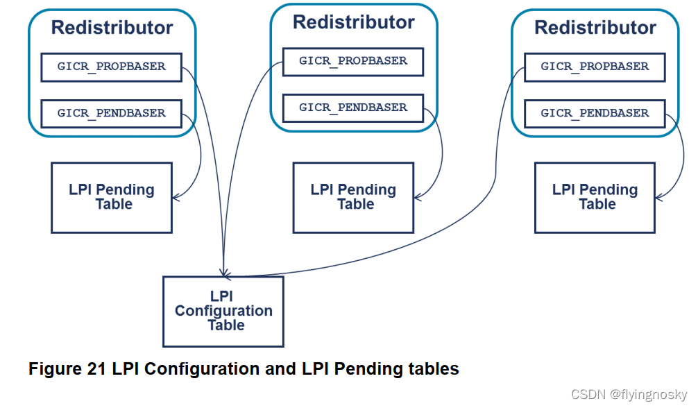 类似的,存储表存储 LPI 状态信息 。GICR_PENDBASER控制LPI进食表。每个再分配者都保留自己的LPI数据库。在再分配工具中,这些表格将不予共享。