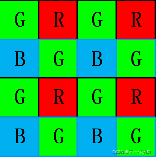 收集彩色图片的最简单方法是为每个像素点使用三值信号收集过滤器。然而,传感器中只有一个。敏感点只能接受光信号,不能区分不同类型的光信号。阵列解决了问题,拜尔由于人类眼睛对绿色更加敏感,采集绿道的光点是传感器光点上其他两个频道的光点的两倍。 bayer 的色彩滤波阵列 G 占 1/2 , R 和 B 各占 1/4 。如下图所示
